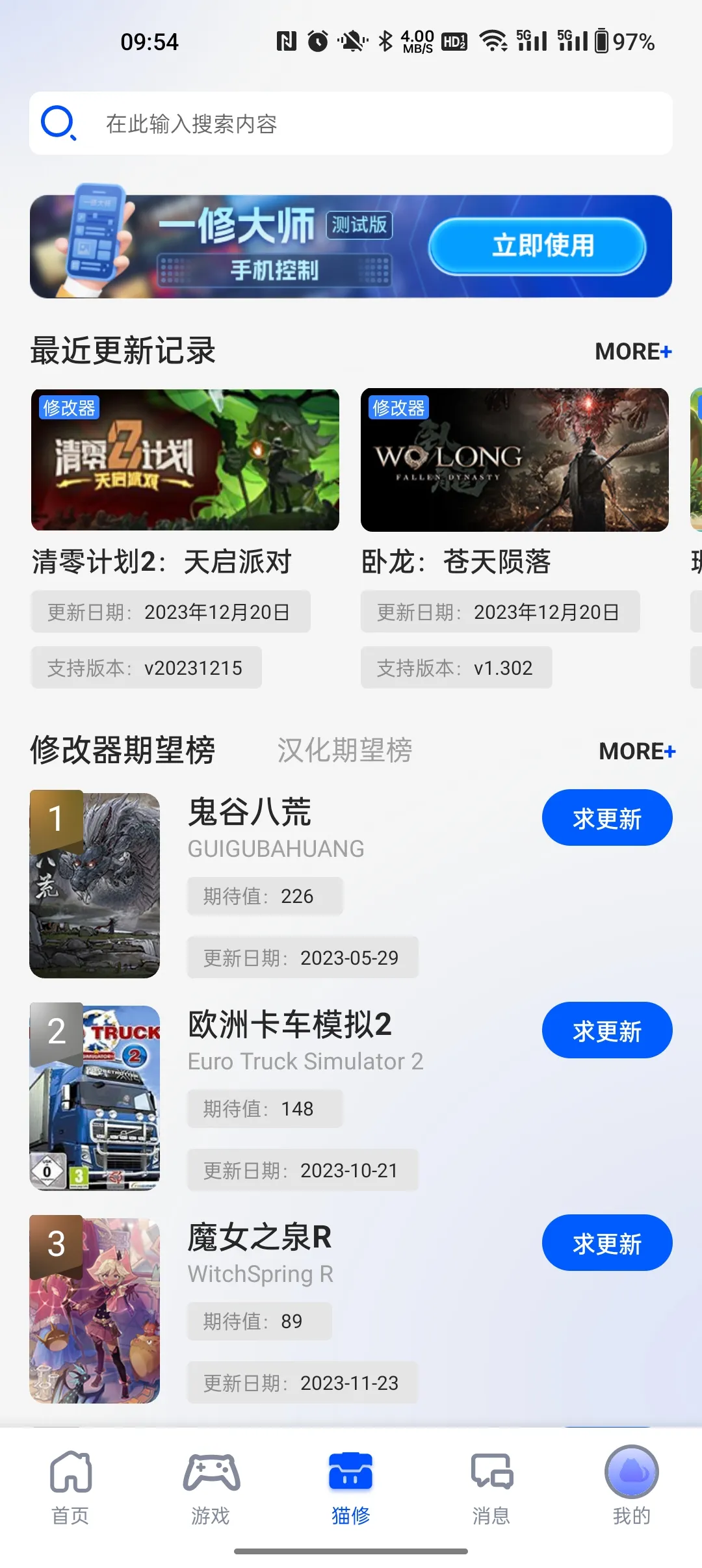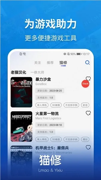 猫修是杭州游侠文化传媒旗下、由一修大师和老猫汉化团队联合推出的游戏服务平台。集游戏资讯、攻略、下载等功能于一体,有丰富资源、多样社区,能智能推荐通关策略,还支持修改游戏参数,保护隐私。
