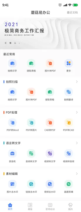 蘑菇易办公是一款功能全面的办公软件,支持图片扫描、PDF格式互转、语音转文字等。提供海量免费模板与职场培训,操作便捷,能一站式解决办公难题,满足多场景办公需求 。