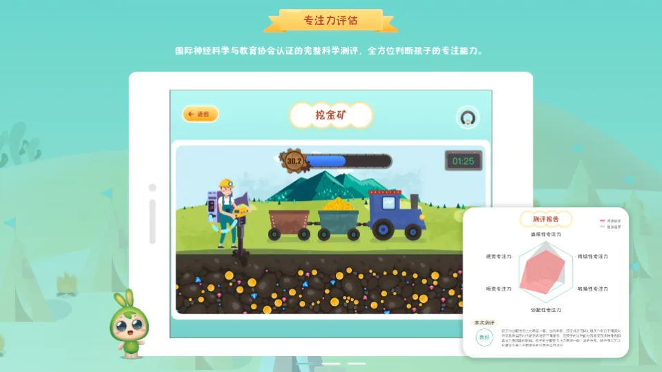 4、科学评估体系:专注力评估由国际神经科学与教育协会认定,能全方位判断孩子专注力发展情况,即时生成报告并推荐定制化课程 。